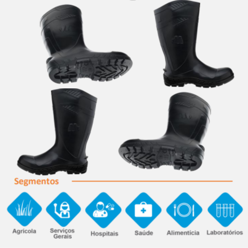 Ideal para profissionais que atuam em indústrias, construção civil, serviços gerais, limpeza pesada e áreas úmidas, oferecendo proteção confiável para os pés em qualquer situação.