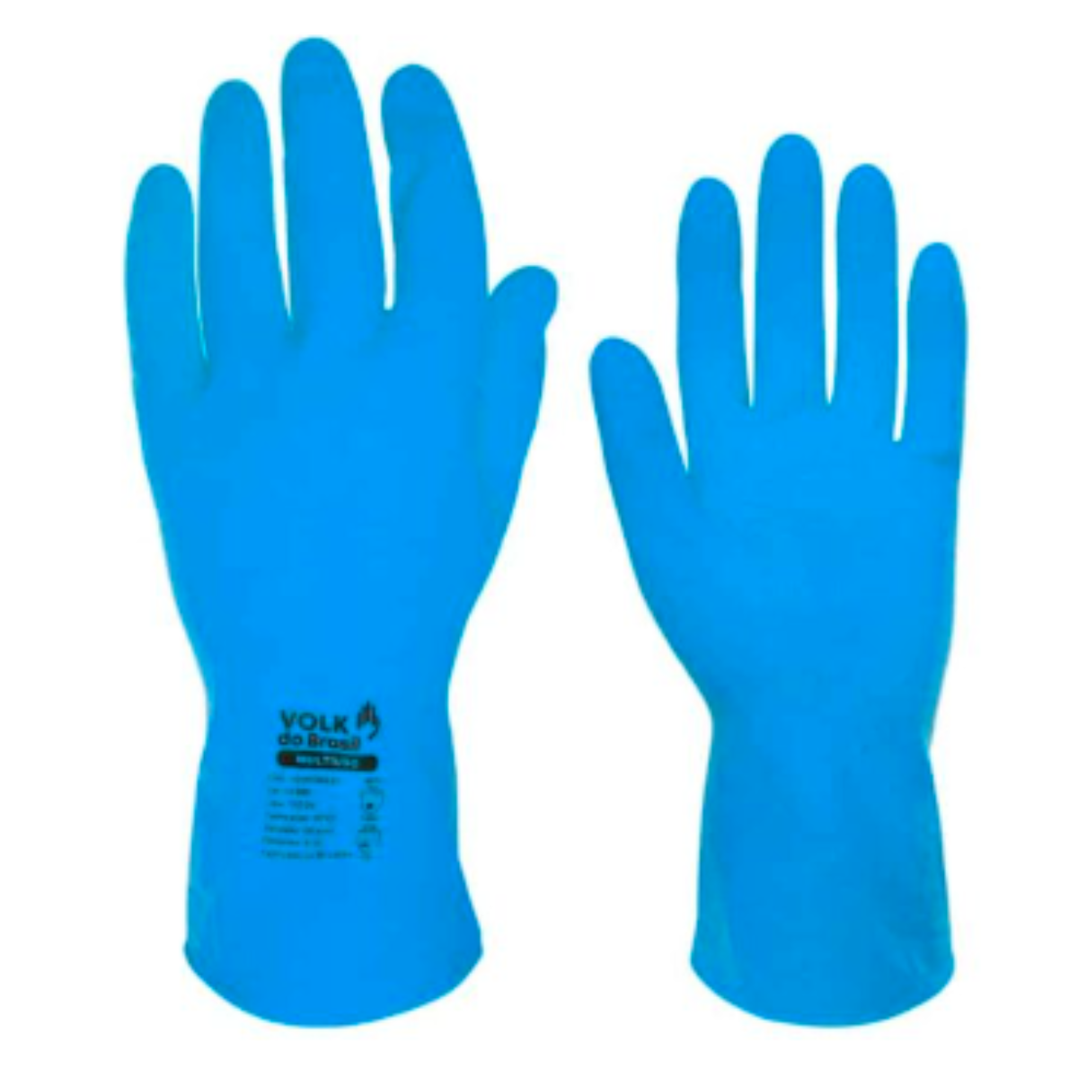 Luva de segurança confeccionada em borracha natural, revestida internamente com flocos de algodão, antiderrapante na face palmar e nos dedos, lisa na face dorsal e punho.